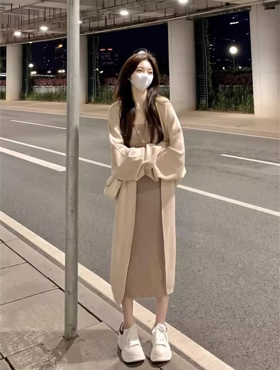 スタイルアップしたい女性におすすめのカーディガン&ワンピースのセットです。カーディガンもワンピースもロング丈で、縦長のデザインは細見え効果抜群◎