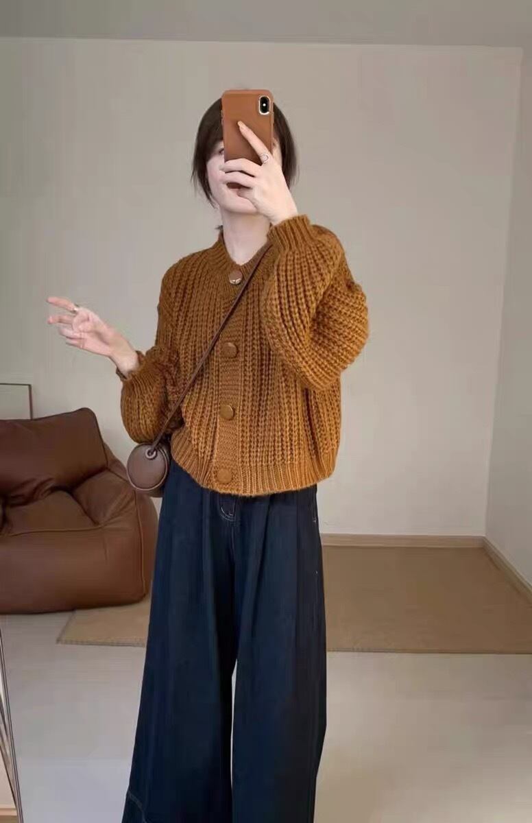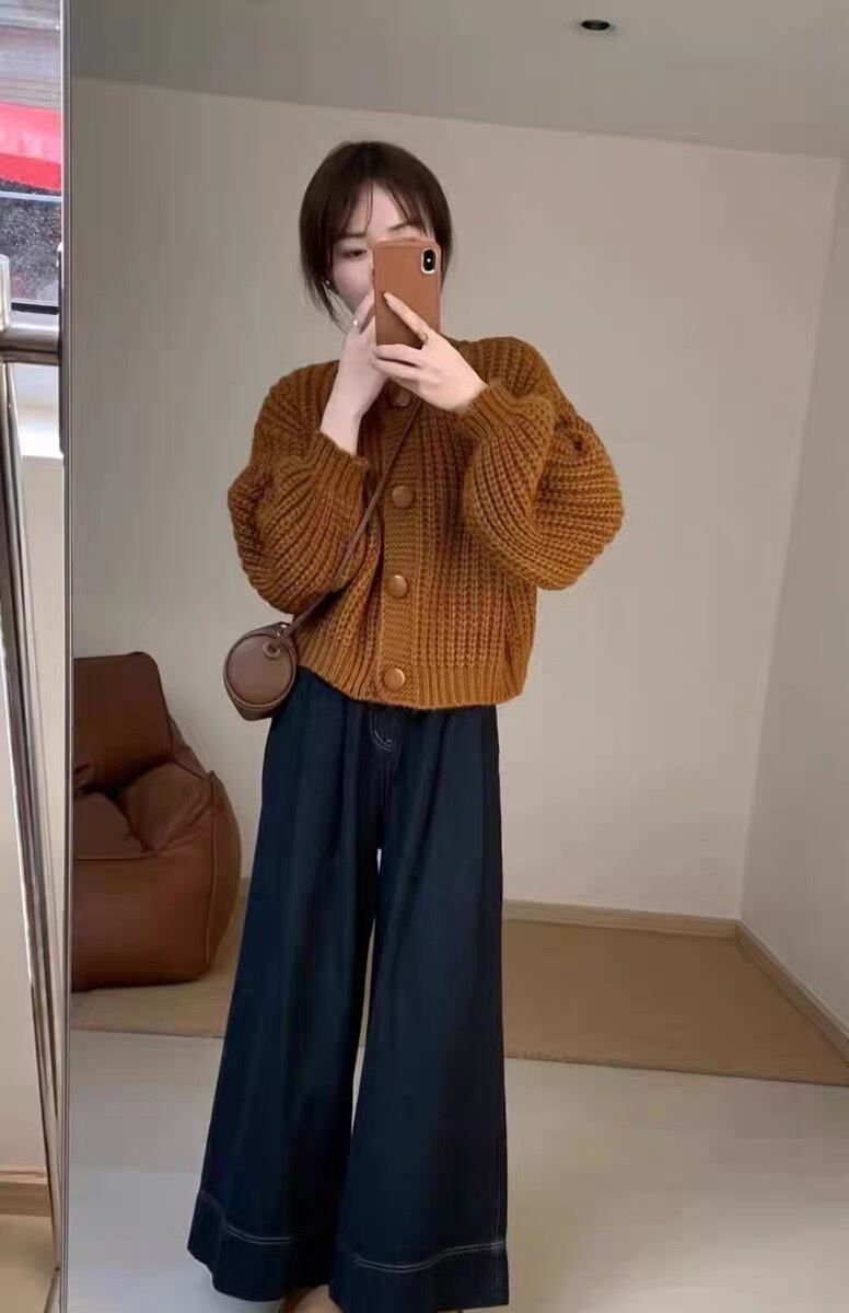 秋のファッションにぴったりのシックなレトロコーデセットが登場しました!ゆったりとしたざっくり編みのカーディガンとフレアパンツのセットです。