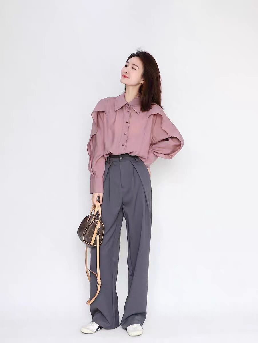 このセットは、くすみピンクのシャツに袖に施されたレースが上品さをプラスし、グレーのパンツにはタックが施されている個性的なデザインです。オフィスカジュアルからカジュアルなシーンまで幅広く活躍するセットです。