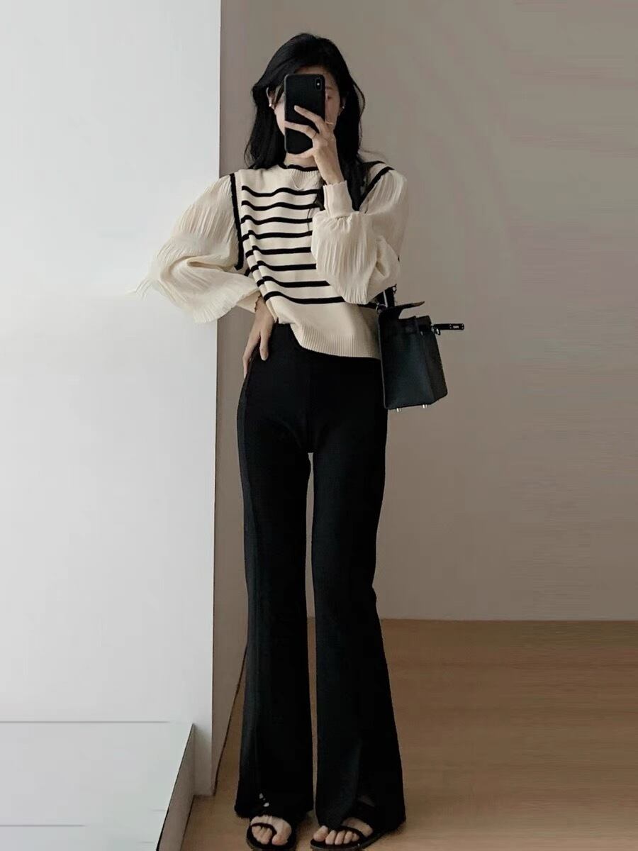 定番のボーダーニットを異素材でアレンジし、女性らしいシルエットを演出しています。パフスリーブのトップスと、細身の黒パンツの組み合わせは着痩せ効果も期待できます。