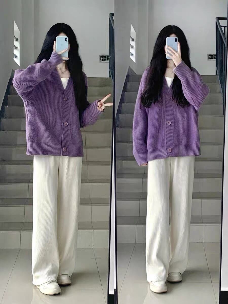 清楚で女性らしいデザインが魅力の一着。パープルのVネックカーディガンとデニムのロングスカートがセットになっており、シンプルながらもおしゃれなコーディネートが楽しめます。