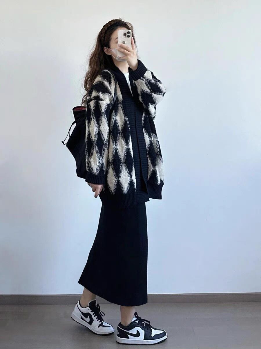 シンプルな黒が大人っぽく、アーガイル柄がさりげないアクセントとなります。カーディガンはゆったりとしたシルエットで、着心地も抜群。スカートはワンピースタイプで、足元までしっかりと包み込んでくれます。