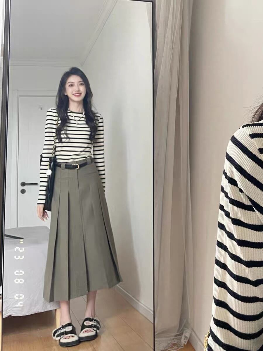 上品な印象のシンプルなデザインが特徴の2023秋服セットです。トップスはボーダー柄の長袖で、スカートはロング丈のプリーツスカート。シンプルながらも高級感を感じさせる仕上がりで、カジュアルな着こなしでも上品さを演出します。